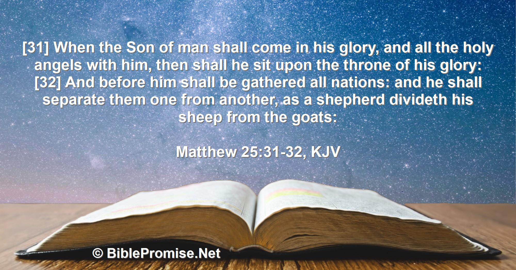 [31] When the Son of man shall come in his glory, and all the holy angels with him, then shall he sit upon the throne of his glory: [32] And before him shall be gathered all nations: and he shall separate them one from another, as a shepherd divideth his sheep from the goats: