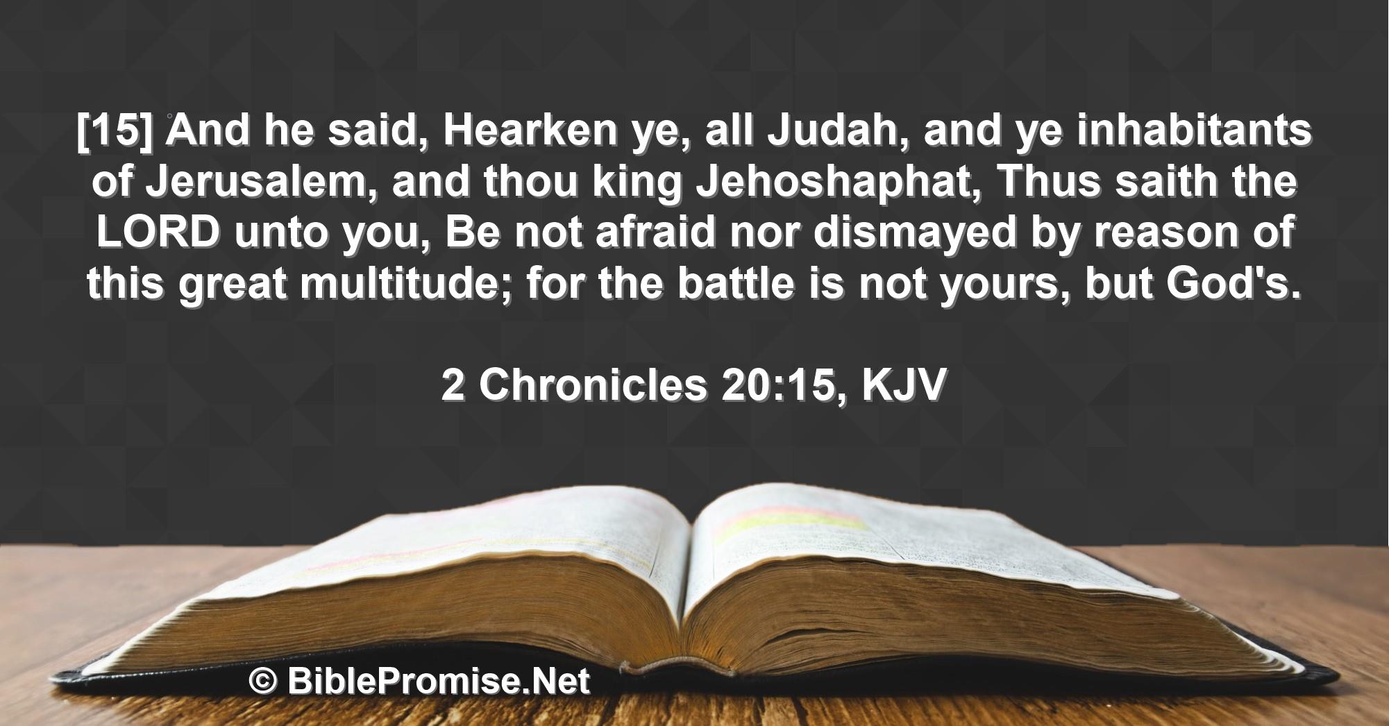 [15] And he said, Hearken ye, all Judah, and ye inhabitants of Jerusalem, and thou king Jehoshaphat, Thus saith the LORD unto you, Be not afraid nor dismayed by reason of this great multitude; for the battle is not yours, but God's.