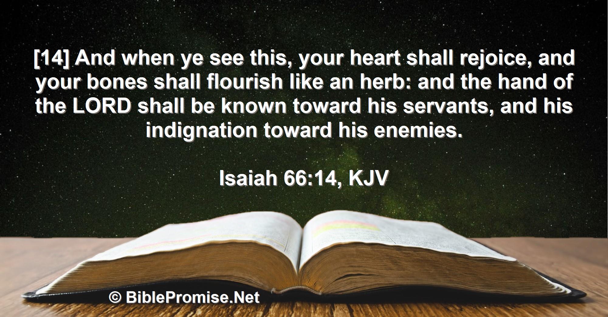 [14] And when ye see this, your heart shall rejoice, and your bones shall flourish like an herb: and the hand of the LORD shall be known toward his servants, and his indignation toward his enemies.