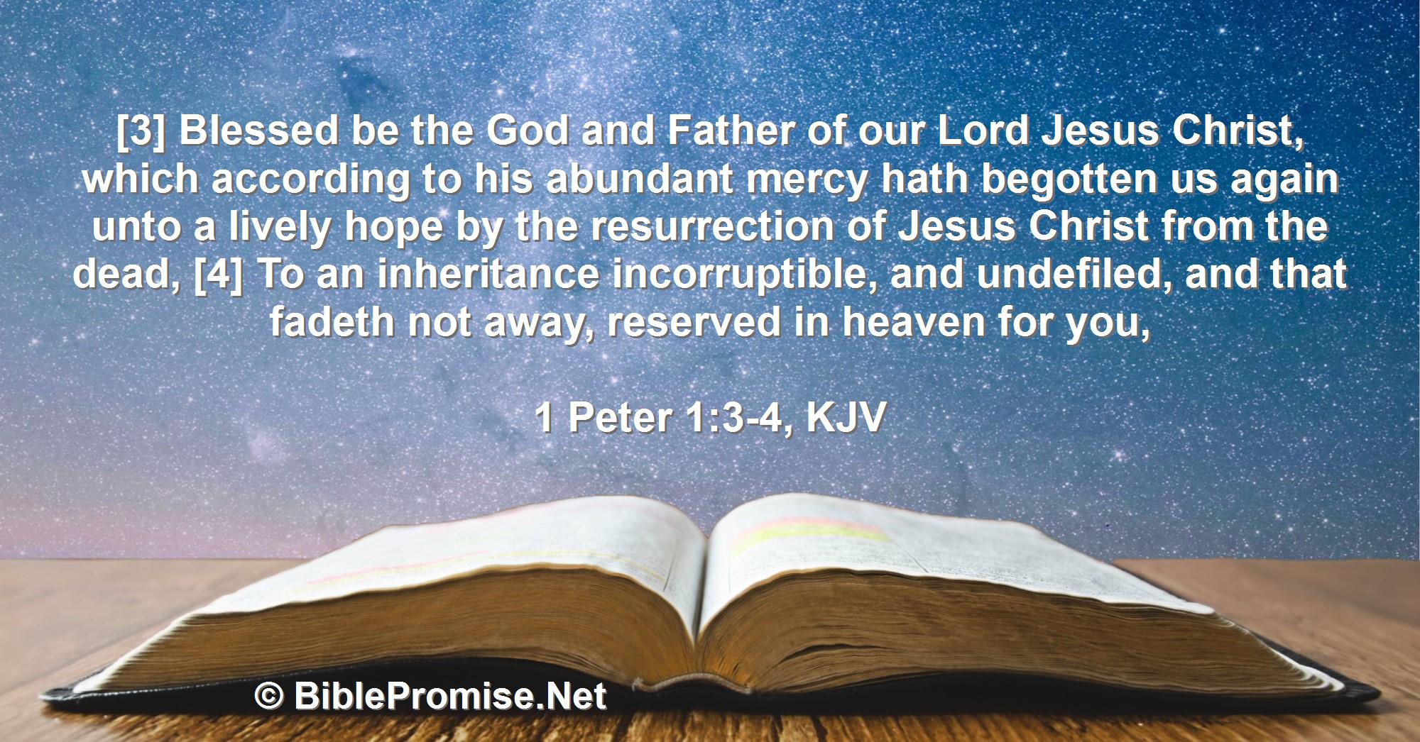 [3] Blessed be the God and Father of our Lord Jesus Christ, which according to his abundant mercy hath begotten us again unto a lively hope by the resurrection of Jesus Christ from the dead, [4] To an inheritance incorruptible, and undefiled, and that fadeth not away, reserved in heaven for you,