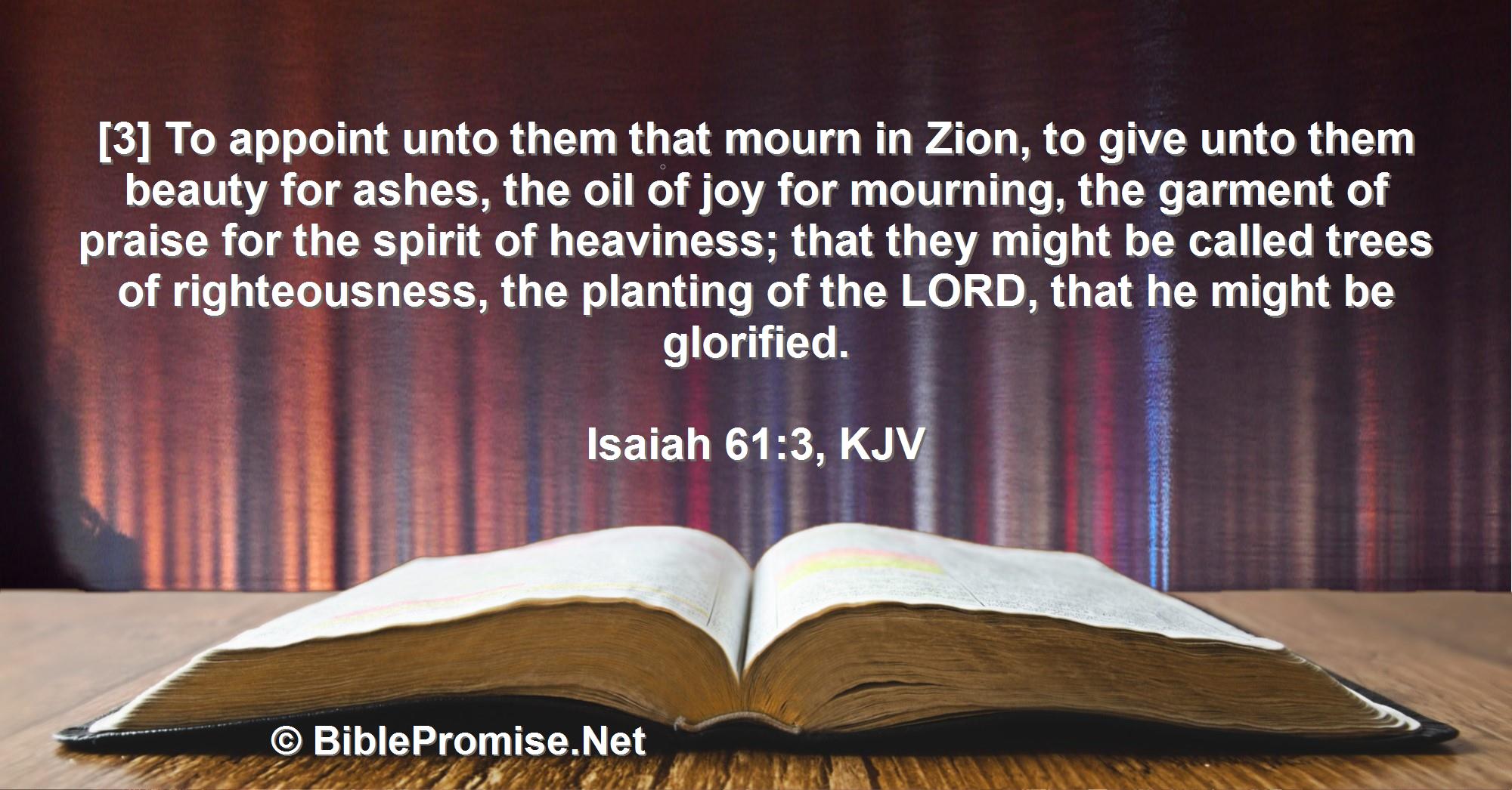 [3] To appoint unto them that mourn in Zion, to give unto them beauty for ashes, the oil of joy for mourning, the garment of praise for the spirit of heaviness; that they might be called trees of righteousness, the planting of the LORD, that he might be glorified.