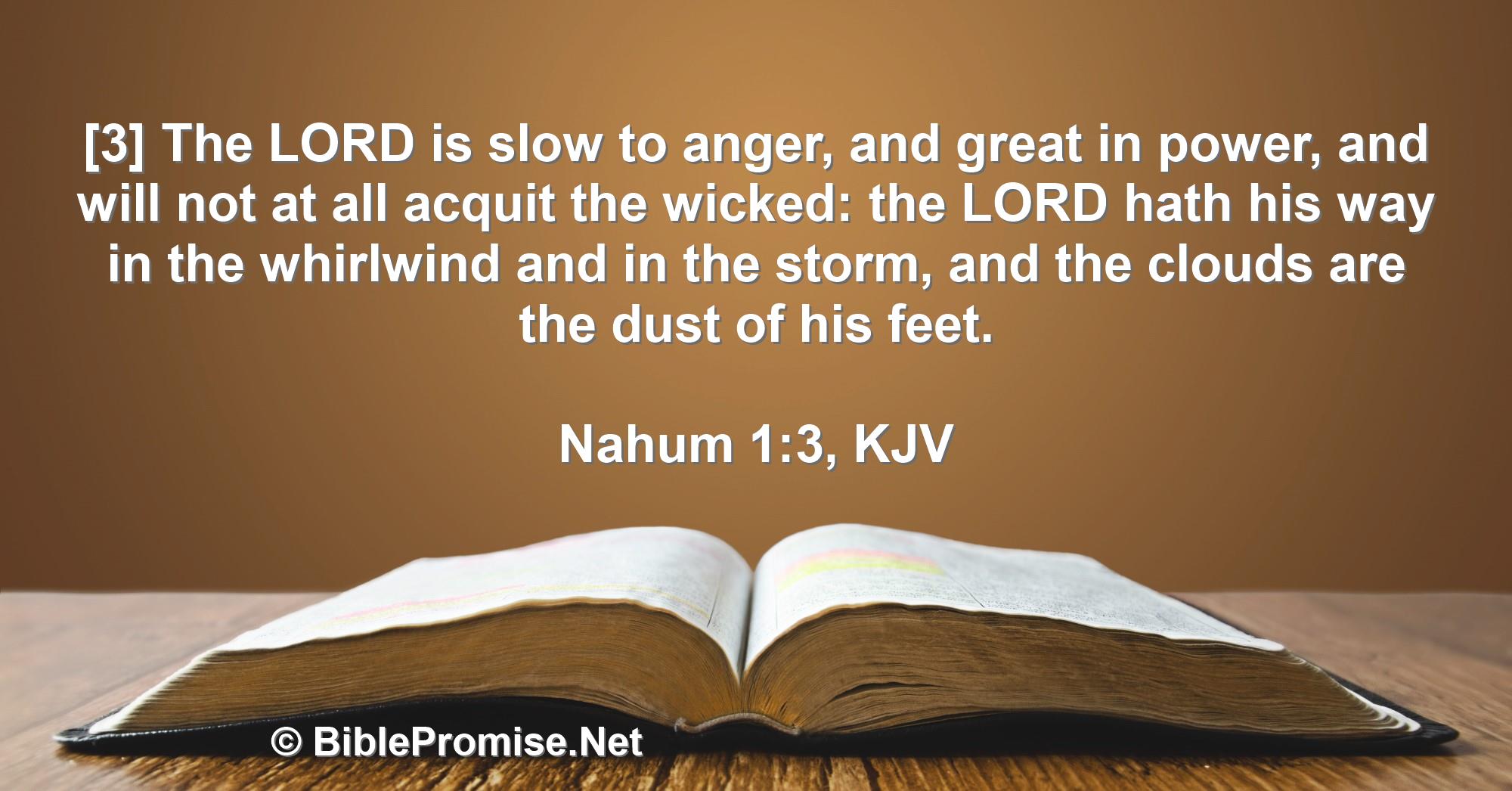 [3] The LORD is slow to anger, and great in power, and will not at all acquit the wicked: the LORD hath his way in the whirlwind and in the storm, and the clouds are the dust of his feet.
